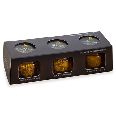 This Preserved Truffle Selection gift set contains three luxurious preserved black truffle products; Minced Black Truffle (1.74oz), Black Truffle Slices (1.74oz) and Black Truffle Sauce (Tartufata) (1.74oz). We slice & preserve our fresh truffles at the peak of the season, when they are at their most flavourful allowing you to enjoy the incredible taste of truffle at any time of year.